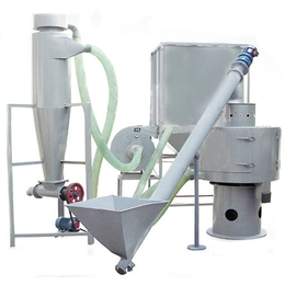 氣流篩粉機(jī)與氣固分離除塵裝置組成閉路篩分系統(tǒng)。主機(jī)是氣流篩粉機(jī),篩體的密閉外殼內(nèi)裝有立式圓周筒形篩網(wǎng);篩網(wǎng)內(nèi)側(cè)有圓周形風(fēng)輪,由裝于底座上的電動(dòng)機(jī)驅(qū)動(dòng)旋轉(zhuǎn);篩體外殼的正上方裝有進(jìn)料斗及粗篩,下部設(shè)有排渣口;電動(dòng)機(jī)與主軸為皮帶連接;風(fēng)輪料斗下口形成進(jìn)料間隙。氣固分離除塵裝置由引風(fēng)機(jī),沉降室和除塵布袋組成,氣流篩與分離除塵裝置之間由塑料波紋軟管連接。
